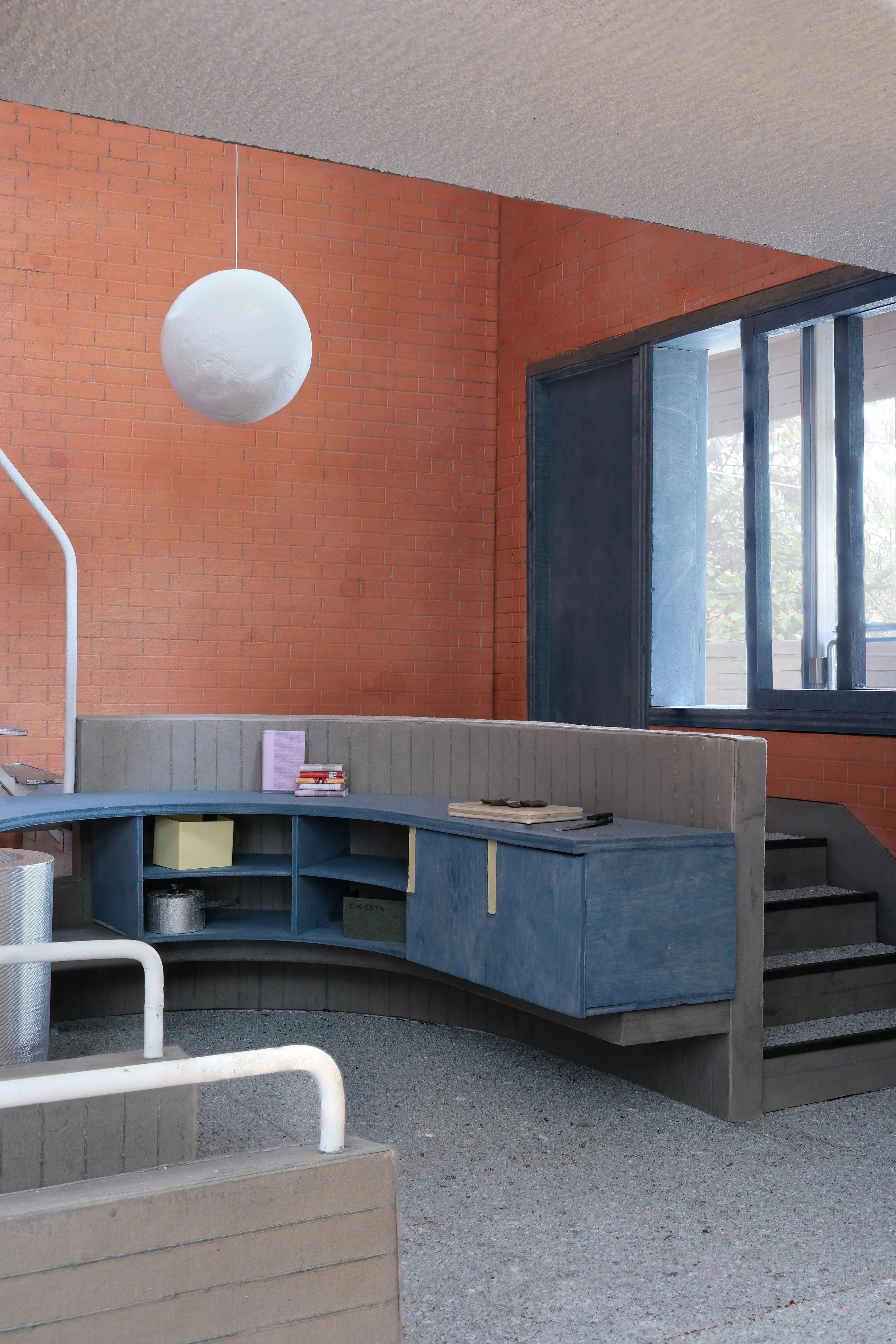 A generous opening in the facade brings natural light into the communal area and strengthens the connection between inside and outside. A minimally invasive kitchen extension integrates into the communal core, improving functionality without compromising the original design. Bedrooms gain flexibility through mirrored central closets and sliding doors, enabling spatial connections and shared workspaces. The bathroom is reconfigured into stacked capsules, freeing space for a communal bench beneath the skylights that serves as a shared dining and social area.